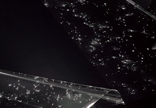 PPF 具有優異的韌性,對於高速行駛時迎面而來的小碎石撞擊,提供預防的保護作用。下圖為使用碎石機模擬撞擊狀態,有貼膜的左半部,將膜料撕開後漆面毫髮無傷。