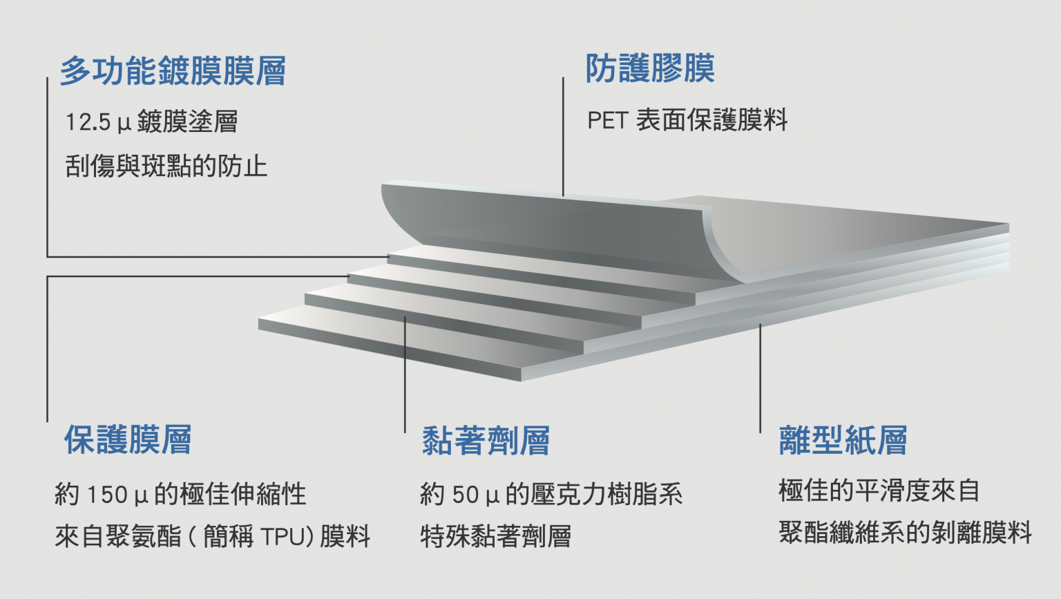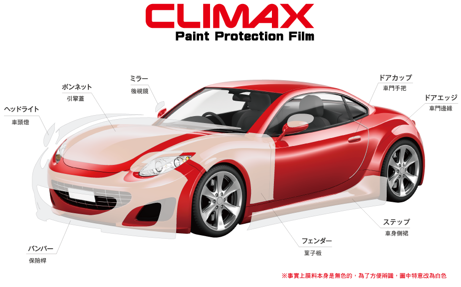 CLIMAX Paint Protection Film 透明保護膜是一款具有穩定品質、在日本本土製造的產品,構造上含有約 150μ 的高分子聚氨酯 (TPU) 膜料層及約 50μ的壓克力樹脂系特殊黏著劑層,有著高透明感及優異的耐衝擊性。 膜料本身表面有 12.5μ 多功能鍍膜塗層,具有良好的防污性能及撥水 ‧撥油效果,透過簡單水洗即可常保乾淨。而且保護膜具有自體修復功能,一些細微的刮傷透過太陽熱能即可自然修復,是保護漆面、維持光澤的極佳選擇。